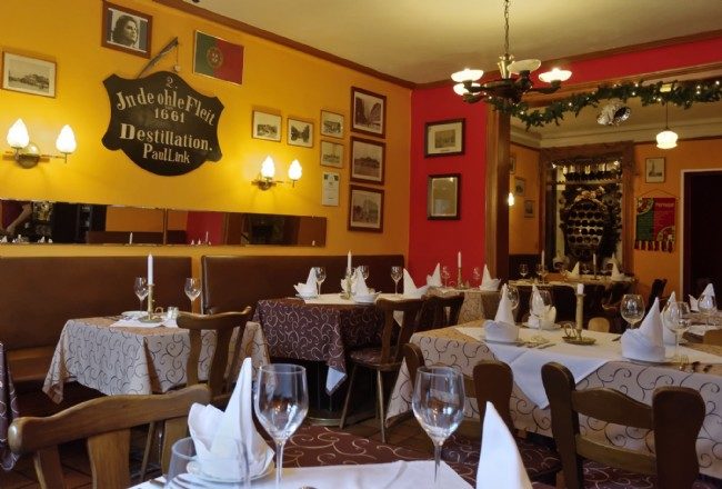 Das traditionsreiche Gebäude entspricht unserer Philosophie, die Traditionen der portugiesischen Küche zu bewahren, ohne die Veränderungen der vergangenen Jahrhunderte zu ignorieren. Zahllose ursprünglich aus fernen Ländern stammende Gerichte wurden so zu portugiesischen Klassikern. Ebenso halten wir es mit der Einrichtung, denn nicht nur die von uns bevorzugten warmen Farben wie Braun und Weinrot sollen zu einer gemütlichen Atmosphäre beitragen, sondern auch die Verwendung von Holz.